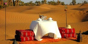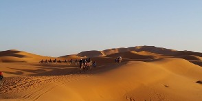 Desert tour from Ouarzazate continues and we explore Todra Gorges, famous rock canyon. Then we pass few Berber villages to reach Erfoud , famous for its fossil products. Passing the oasis of Tafilalet, we continue to Rissani and then to Merzouga desert. In Merzouga Sahara desert we ride the camels into the sand dunes. We will enjoy beautiful desert sand. We spend this night in an Nomad desert camp with Berber dinner. Local guides will play drums music for us in the middle of the Sahara desert. We enjoy amazing desert sunset and then we spend the night in Nomad tents.
