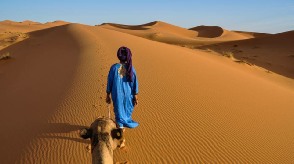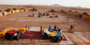 Desert tour from Marrakech continues and we explore Dades gorges , then Todra Gorges, famous rock canyon. Then we pass few Berber villages to reach Erfoud , famous for its fossil products. Passing the oasis of Tafilalet, we continue to Rissani and then to Merzouga desert. In Merzouga Sahara desert we ride the camels into the sand dunes. We will enjoy beautiful desert sand. We spend this night in an Nomad desert camp with Berber dinner. Local guides will play drums music for us in the middle of the Sahara desert. We enjoy amazing desert sunset and then we spend the night in Nomad tents.